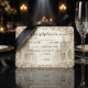 This design features a sophisticated monochromatic palette of soft creams, champagne beige, and warm neutral tones. The background showcases a detailed sketch of cathedral spires and gothic arches, framed by an intricate border of swirling acanthus leaves and roses. The typography blends traditional formal serif fonts with sweeping, elegant calligraphy. This is a flat printed image with a printed faux stone effect; it does not contain actual raised carving or 3D texture.
