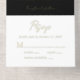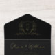 Elegant black all-in-one wedding invitation featuring your monogram initials inside a vintage wedding crest, your names, "Reception to follow" and "Rsvp" showcased in a chic calligraphy script, your invitation details in classic serif typography, and a white tear-away RSVP response postcard, all rendered in your choice of genuine gold, silver or rose gold foil. You can adjust the size of the script for longer or shorter names by editing in the design tool if desired.