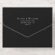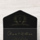 Elegant black all-in-one wedding invitation featuring your monogram initials inside a vintage wedding crest, your names, "Reception to follow" and "Rsvp" showcased in a chic calligraphy script, your invitation details in classic serif typography, and a white tear-away RSVP response postcard, all rendered in your choice of genuine gold, silver or rose gold foil. If desired, you can adjust the size of the script for longer or shorter names by editing in the design tool.