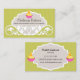 © 2014 Socialite Designs. Elegant, decorative swirl design banner and striped background, in green, baker business card. The design incorporates a gourmet yellow and pink cupcake design on the front and back. All design elements can be individually moved, resized, or deleted by customizing the business card.
