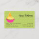 © Socialite Designs. Promote your bakery business with the cute and colorful cupcake business cards. Our design has an orange slice cupcake inside a pink cup. Your business text goes inside a whimsical scalloped circle and finished off with a pink polka-dot ribbon.