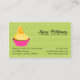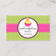 © 2012 Socialite Designs. Promote your bakery business with the cute and colorful cupcake business cards. Our design has an orange slice cupcake inside a pink cup. Your business text goes inside a whimsical scalloped circle and finished off with a pink polka-dot ribbon.