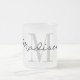 Elegant custom name monogram frosted glass tea mug gift. Classy coffee cup with monogrammed name initial letter. Stylish script typography in custom colors. Chic Birthday or Christmas gift idea for best friends, family, school teacher, greatest coach, super boss, nice co worker, handsome husband, lovely wife, fine boyfriend, pretty girlfriend, charming dad, foxy aunt, delightful daughter, gorgeous spouse, etc. Exclusive good looking presents for him and her. Ideal black and white print. Personalized drinkware with excellent design.