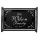 Elegant custom year established family name black and white serving tray. Personalized design with swirly border corners. Add your own surname, message, monogram initial letters, established year, inspirational quote, fun saying or quotation. Pretty decorative gift idea for newlyweds, friends, family etc. Create your own classy servingtray. Customizable kitchen accessories for your house or BBQ party. Stylish gift idea for him and her. Available in small and big size.