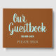 This generic guest book features the messages "Our Guestbook" and "PLEASE SIGN", along with a personalized date. The text is colored turquoise, and the background is colored brown. A generic, customizable guest book like this might be used at an event such as a baby shower, a wedding, a funeral, or some other event.