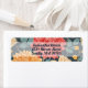 A return address label featuring elegant red and yellow dahlia flowers on a dark blue background.