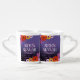 Nothing says "you complete me" or "your better/other half" than these floral-themed lovers' mugs, which feature elegant white lettering with lavender purple confetti and garlands of colorful African daisies on a violet purple to black background. Customize with the newlyweds' names and wedding date. Reverse shows identical design. Use as is, or modify as desired.