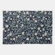 This seamless floral pattern features delicate white daisies with soft yellow centers, surrounded by pale green leaves and tiny buds, all set against a deep navy blue background. The design exudes a classic, timeless elegance perfect for wallpapers, textiles, and stationery. The contrast between the vibrant flowers and the dark backdrop creates a sophisticated and calming aesthetic.