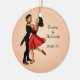 These elegantly-dressed ballroom dancers accompany your own text on this romantic keepsake ornament. The adorable couple in the design have a warm tan skin tone and black hair, with gleaming brown eyes. The beautiful, dark-haired girl wears a red silk dress and red-and-gold shoes. Her dance partner is a charming young man in Western-style formal wear. Complete it with your own names and event date to create a gift for someone you love.