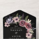 Elements: watercolor floral elements, roses, other flowers, greenery, feathers, rich dark tones. Contemporary serif fonts with script accents Colors: black, burgundy, pink, blush, mauve, tan, ecru, lavender, purple, plum, dusty blue, green. Themes: modern, dark, elegant, moody, floral, botanical, garden, winter, contemporary, lush, sophisticated. Collection: Elegant Dark Floral Cascade Black Burgundy Wedding Collection. Product Type: All-In-One Invitation