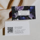 Elegant floral business card design features pale lavender purple roses and deep indigo blue peonies on a dark and dramatic background. Add your name or business name in modern lettering, overlaid on a white element in the center. Personalize the reverse side with your contact information, along with a customizable QR code.