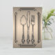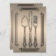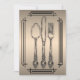 Invite your dinner guests in style with this simple and elegant invitation. This invitation has a metallic look bronze gradient with a modern line border in black. In the center there is a sketch of a spoon, knife, and fork. The back has a matching background and a place for your custom invitation wording. Change the details to suit your event. All elements are printed on our high quality products, they do not include any real gold, jewels, embossing, or other textile elements. All designs are copyright Noteable Expressions, Inc. All rights reserved.