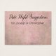 Here's a fun accessory to pick up for your engagement party or joint shower: date night suggestion cards on which guests can write personal notes to the bride and groom. On the front you read "Date Night Suggestions" in an elegant, modern script font; this typeface is editable so you can choose another if you prefer... or even write a different message. Below there's a place for your names. All words are presented in black type. Both front and backs of the card were covered in a subtle, distressed grunge image that features swirling lacy designs and burlap, along with pink and beige elements. The texture was covered in an opaque white overlay meant to lighten the surface and provide plenty of contrast for the text both printed and written on the surface. The back was left without words, providing a space for longer, personal handwritten notes your guests are encouraged to provide. Please do not hesitate to reach out to me if you have special requests or need other items. I am also happy to help with customization of these cards if you need. //