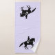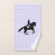 Towel set with a black and white illustration of a dressage rider. The horse and rider are performing a pirouette. Classy and beautiful. Set on a watercolor background in delicate and muted pastel colors Light purple background.