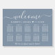 Elegant dusty blue wedding seating chart foam board sign for up to 10 tables featuring "welcome" in a chic white script, your names and wedding date joined together by a heart and "We're so glad you're here" in classic white serif typography.