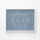 Elegant downloadable dusty blue wedding seating chart poster for 7 tables featuring "welcome" in a chic white script with swashes, your names and wedding date joined together by a gold heart and "We're so glad you're here" in classic white serif typography. You can select the digital download option to edit with last minute changes and print locally.