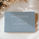This elegant wedding guest book is perfect for stylish, modern weddings. The guest book features your names and wedding date in silver foil lettering with a dusty blue background. Add your custom text to the spine of the minimalist wedding guest book. The back of the foil guest book features your horizontal engagement photo.