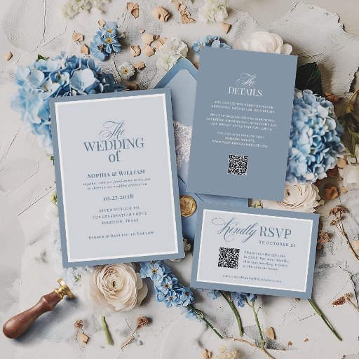 These elegant, luxe wedding menu cards feature a dusty blue border and a lighter blue and white design. There is a mix of classic text and modern calligraphy for a classy and minimalist design perfect for your timeless, formal wedding.