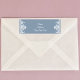 This elegant return address label features a dusty blue background with intricate white floral and scrollwork designs on the left and right sides. The center is reserved for personalized text, such as a name and address, written in a beautiful script font. The design has a classic, vintage feel, making it suitable for wedding invitations, formal correspondence, or any occasion that requires a touch of sophistication.