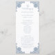 Rustic dusty blue wedding program featuring elegant floral lace.