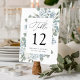 Elegant floral wedding table number cards featuring the table number, your names, and wedding date framed by dusty blue and white roses and hydrangeas with lush eucalyptus leaves and greenery. The dusty floral table numbers are perfect for your spring or summer wedding. Designed to coordinate with our Elegant Dusty Floral wedding collection.