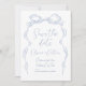 Elegant save the date cards feature hand drawn ribbon bow with modern handwritten script fonts in dusty blue, clean and simple. Great for modern romantic wedding, unique fun whimsical wedding, elegant casual wedding.