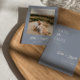 The matter paper is our sample of choice -- it's a reasonably priced, good quality, nice feeling paper stock. We were a little concerned the muted rustic blues might not reproduce all that well (usually by light colored samples), but they're just gorgeous! The white lettering is perfect in combination with the blue background, and the typography is all easy to read.