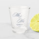 Elegant dusty blue calligraphy script Mr & Mrs personalized wedding shot glasses, can be a lovely bridesmaids groomsmen and guest favor gift.