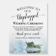 This beautiful "unplugged" sign is a wonderful way to welcome guests to your wedding while politely asking them to turn off their phones, cameras, and devices so they don't interrupt the ceremony. It features an elegant design with lacy script calligraphy and a single long-stemmed pale dusty blue colored rose reflecting in water with waves and ripples. The message reads: Welcome to our unplugged Wedding Ceremony. Please turn off your Phones, Cameras and Devices So we can all enjoy the Ceremony without Disruptions.