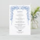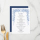 Delight your guests with this beautiful dusty blue floral wedding menu card! Framed by an intricate border of soft blue roses, delicate blooms, lush greenery, and subtle swirling accents, this elegant design lists your reception delights: starters like Caesar Salad with Croutons and Lobster Bisque Soup, mains featuring Filet Mignon with Mashed Potatoes & Roasted Asparagus or Chicken Marsala, vegetarian Penne with Roasted Carrots, dessert options including Wedding Cake, Cupcakes & Brownies, plus an open bar with coffee/tea. Personalized with "Enjoy! SAMANTHA & MARONE AUGUST 26 2022" at the bottom—perfect for table settings, matching your dusty blue suite, and creating a polished, romantic dining experience. Ideal for classic, garden, or boho-inspired weddings!