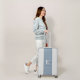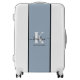 This simple, elegant white hard-sided suitcase with your first name in a trendy script font in black, your first initial in a modern cap font in white, and your full name in CAPS in black on dusty blue is perfect for you. It's stylish and trendy and yet very classic. It will be super easy to spot on the baggage carousel.