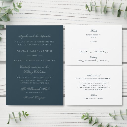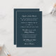 A refined wedding invitation featuring a rich dusty blue background paired with elegant white script and classic serif typography. This design combines traditional styling with a sophisticated color palette, creating a look that feels both timeless and distinctive.