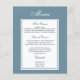Part of our Nautical inspired wedding collection, this dusty blue and white menu has small shells on the reverse. The front has an overlay where you can add your wedding reception menu. Our designer has selected a script font for the courses and heading.
