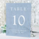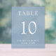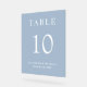 Simple frosted dusty blue acrylic wedding reception table number sign featuring "Table" and the table number in elegant white serif typography, and your names and your reception date in modern white typography. Create each table number and add to your shopping cart one at a time, then check out when all numbers are in your cart.