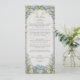 Present your wedding feast with unparalleled elegance using this exquisite dusty blue and white floral menu card. The menu side features a graceful arched top, with the words "The Menu" inscribed in sophisticated script. Delicate white and pale blue blossoms, reminiscent of hydrangeas or similar clustered flowers, along with subtle green foliage, create a stunning, almost three-dimensional border against a soft cream background, framing your culinary selections beautifully.