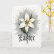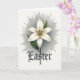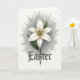 This design shows a tall, centered composition with a luminous white, six-petaled flower as the main focus, set against a softly mottled gray background with scattered speckles near the top. Each petal opens gently with faint golden-yellow shading and fine veins, giving the bloom a tender, almost affectionate softness 🌷. Deep green leaves fan out from a sturdy stem, their textured surfaces adding contrast and a grounded feel. In the middle of the flower, reddish-brown anthers circle a small green center, like a quiet gathering around something cherished. Below the stem, the word “Easter” sits prominently near the bottom in dark, ornate lettering, with the text centered and heavier than the delicate flower above 🐇. A single green droplet hangs from the lower edge of the lettering, visually tying the word to the living plant. The gray backdrop stays light and unobtrusive, while the flower’s white petals and the dark text remain the strongest elements on the page. The final detail is the small green drop beneath the word, shaped like a bead of liquid about to fall.