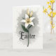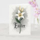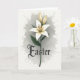 Designed with a single white blossom centered on the front, the petals open wide like a gentle embrace, with two closed buds nearby that feel like close companions 🌷. A rich green stem and leaves rise from below, giving the flower a steady, grounded presence against a bright white background. At the flower’s center, creamy tones mix with reddish-brown pollen tips and a small golden detail that draws the eye in like a tender glance. A soft gray halo circles the bloom, fading outward to create a quiet glow that suggests closeness without needing any figures. Thin, pale lines radiate from the center, adding a subtle sense of connection and shared warmth in the space. Near the bottom, the word “Easter” sits as the main text in dark, ornate lettering, contrasting strongly with the light backdrop 🐇. The layout leaves generous open space between the flower and the text, keeping attention on the bloom while the letters anchor the lower edge. The two unopened buds angle slightly outward on either side of the main stem, framing the blossom like a small, protective pair.