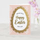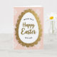 This greeting card centers on a long, egg-shaped white panel that feels like a gentle spotlight on the page, with “Happy Easter” written across the middle in flowing warm-brown lettering. Smaller supporting words sit neatly around the main greeting in dark lettering, arranged to frame the center without crowding it. Around the egg shape, a shimmering gold border bursts outward in an uneven fringe of tiny sparkles, like fine tinsel catching the light. The contrast between the smooth white center and the glittery edge creates a cozy, celebratory look that invites a close glance, like sharing a quiet smile with a friend 🐰. Behind it all, the background is a soft blush pink that reads like early spring warmth, with a tender, calm mood. Faint, translucent floral or clover-like shapes drift across the pink space, adding a soft decorative layer that feels light and airy 🌷. The gold sparkle ring looks slightly raised against the pale field, with scattered flecks extending outward in a loose halo.