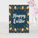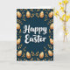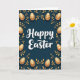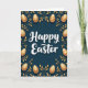 This design shows a dark teal background with “Happy Easter” centered in white lettering, set slightly above the middle so it feels airy and welcoming 🌷. A symmetrical frame of gold leaves and curling stems wraps around the edges, like a gentle embrace that hints at closeness between friends or sweethearts. Nestled within the border are glossy, oval egg shapes in metallic gold, arranged evenly on both sides for a balanced look 🐇. Each egg carries fine decorative details such as thin stripes, small dots, curled lines, and tiny star shapes, adding texture without crowding the layout. The teal backdrop looks velvety, making the gold accents appear softly luminous, as if catching candlelight. Light shadowing under the eggs, foliage, and the central words gives a subtle raised effect, helping the message stand out without harsh contrast. The text remains the only wording on the front, cleanly centered in white against the teal field. Along the perimeter, the gold botanical border alternates leaf clusters and tendrils between the patterned eggs, forming a neat, mirror-like frame.
