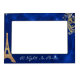 Display your Night In Paris themed party photo, in this chic magnetic frame.  This acrylic magnetic frame is done in dark blue, with swirls and stars, and elegant gold accents of flourishes and a gold glitter looking Eiffel Tower.  White script text reads A Night In Paris, and can be personalized to read what you want.