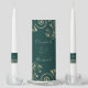 Part of our emerald green and gold swirl wedding collection. This stylish unity candle set will look beautiful in an elegant wedding setting. With ornate swirls, flowers, and flourishes, as a border, around the bride and groom's names which are in a wedding script font. On the taper candles, are the bride and grooms initials also in a light script font.