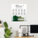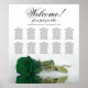 This sophisticated wedding seating chart showcases a beautiful design that includes a single long-stemmed deep emerald green colored rose lying on its side and reflecting in a pool of water. The title reads "Welcome - please find your table" in an elegant font, with the names of the couple and the wedding date displayed below. With 10 tables and space for 100 names, this chart accommodates 10 people per table, making it simple for your guests to locate their seats. This design is both romantic and chic, adding grace and class to your wedding reception.