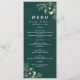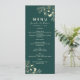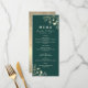 Elevate your wedding reception with this elegant emerald green wedding menu. Featuring a minimalist design adorned with gold floral lace accents, this menu exudes timeless charm and sophistication. Guide your guests through a culinary journey with this tasteful celebration of love and tradition.