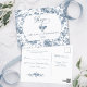 Elegant and ornate vintage blue and white toile de jouy pattern featuring exotic flowers, vines and foliage intertwined with garlands and baskets of roses. Includes a sculpted blank label with formal RSVP text graphic in a custom script font as well as editable text fields. The back features additional text fields with complementary floral embellishment. Shop matching products in Collections at the Grafixmom store.