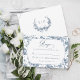 Elegant and ornate vintage blue and white toile de jouy pattern featuring exotic flowers, vines and foliage intertwined with garlands and baskets of roses. Includes a sculpted blank label with formal RSVP text graphic in a custom script font as well as editable text fields. The back features a complementary floral wreath encircling your monogram. Shop matching products in Collections at the Grafixmom store.