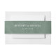 Elegant Eucalyptus green wedding invitation belly band personalized with the bride and groom's names and the wedding date in a classic serif font.