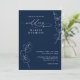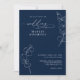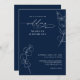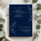 This wedding invitation features a rich navy blue background with clean white script typography. Delicate eucalyptus greenery appears in thin line art, adding a soft botanical touch. The layout is formal and elegant, with modern spacing and a refined style. This design is ideal for couples who want a classic navy blue theme with fresh greenery accents. It creates a calm, polished, and timeless look for any formal or modern wedding.