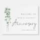 Elegant Eucalyptus Name Welcome Anniversary Party. Modern minimalistic style to greet your guests to your anniversary celebration with watercolor foliage to the left and a set script for the occasion wording. Easily personalise the rest of the text.