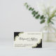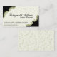 Profile card with leaf ornament drawings on two corners over a black background. Useful for any business owner looking for a formal design on their business card. Customize with your business information. Sample text is a layout suggestion. Text fields can be moved, added to, or deleted as needed. Use the back of card to add more text if desired.