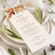 Elegant Fall Leaves Autumn Wedding Menu features a beautiful bouquet of autumn leaves in rust, yellow, gold, mustard, brown and purple.